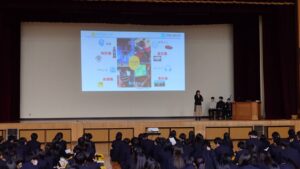 講演の前半では,著作権が持つさまざまな種類とその重要性について詳しくお話しいただき,学校生活の中にも多くの著作権が関わっていることに気づくことができました。
