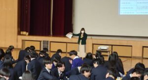 高校3年生は,総合的な探究の時間の一環として,知的財産に関する講演会を実施しました。