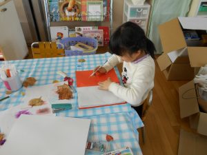 今日から朝の体操「タタロチカ」    今週の土曜日は「ピッコロひろば」です。みんな一生懸命に取り組んでいます。                      すみれ組 はっぱのこすりだしをして、それを元に絵本作りがはじまりました。