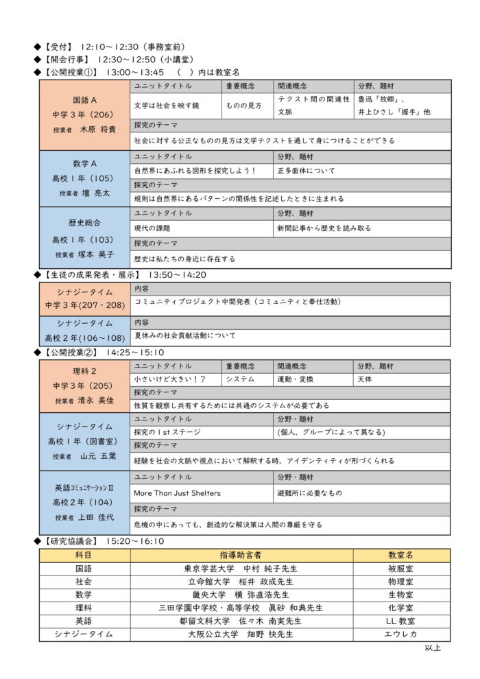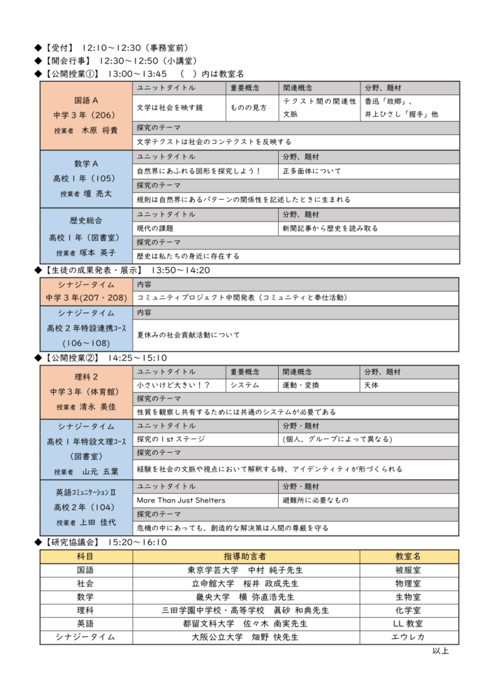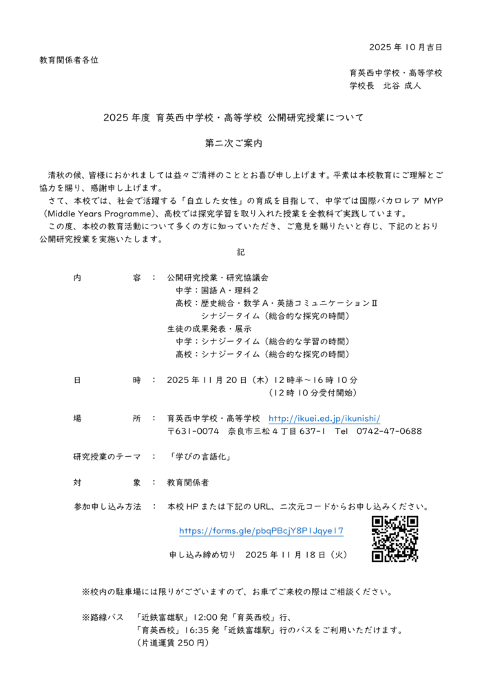 2025年11月20日(木)12時30分~16時10分に公開研究授業を行います。