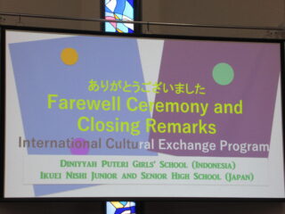 最後に送別セレモニーを行い、ディ校の生徒さん達が、それぞれこの3日間の交流体験の感想を述べてくれました。みんな心から感謝の気持ちを述べてくれましたので、育英西のみんなもとても誇らしく感じました。