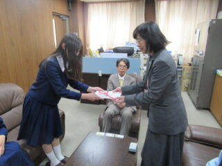 9月の文化行事の模擬店での売上金から、23,190円を奈良市社会福祉協議会様に寄付することを決め、前生徒会の3名から贈呈いたしました。