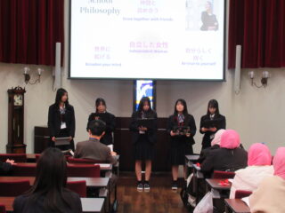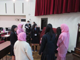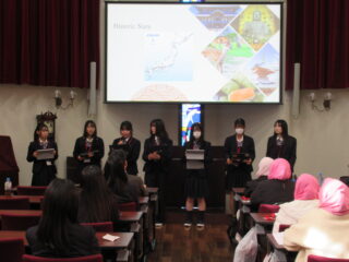 交流委員による本校や日本文化についての紹介は、英語で丁寧に伝えることができました。ディニアプトリの皆さんからもインドネシアの文化紹介をしていただき、日本文化との違いに驚きも多かったです。