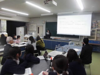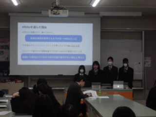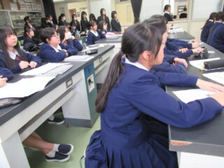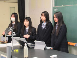 高2生は、文系の個人(16名)、理系のグループ(15チーム)が、被服室・物理室・化学室・生物室に分かれ、司会とタイムキーパーの進行のもとに、今までの探究の経過や成果をスライド発表しました。
