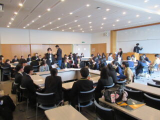 開会式の後は、最初のプログラムである「生徒交流会」です。「Future of Education(教育の未来)」というテーマのもと、全国から集まった高校生たちとグループに分かれ、英語でのディスカッションに挑みました。自分たちの考えを英語で伝え合い、最後には話し合った内容をプレゼンするという密度の濃い時間でしたが、他校の生徒との交流は3人にとって非常に大きな刺激になったようです。