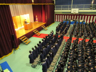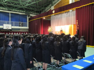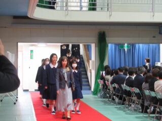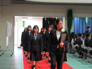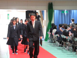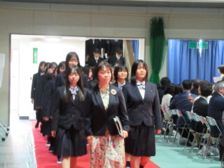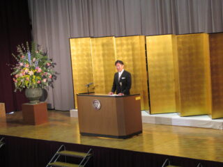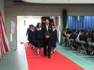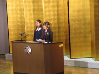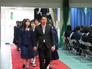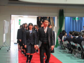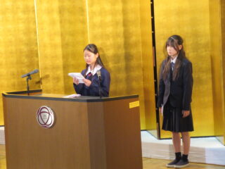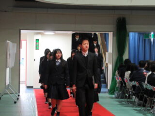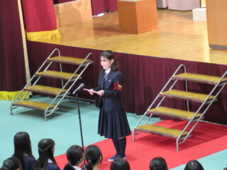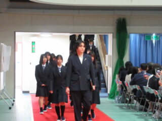 在校生代表として、生徒会長からは、「困難に遭遇したら、先生方・先輩方に相談してほしい。一人で抱え込まず、周りの人に頼ることができるように」とのアドバイスがありました。また、これからの学校生活については、「何事も遠慮せず、挑戦し、悩んでください。挑戦を重ねるうちに、自分の成長・出会いにつながるはず」と、これまでの自分自身を振り返りながら、後輩たちへのエールを送っていました。
